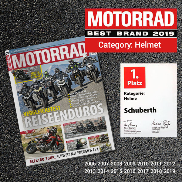 С тех пор как 14 лет назад был запущен опрос читателей «Лучшие Бренды», SCHUBERTH всегда выигрывал категорию шлемов. В этот раз в голосовании приняли участие около 51 500 читателей MOTORRAD. На вопрос, какие именно бренды выделяются, 61,6% проголосовали за SCHUBERTH. Это уже шестой раз подряд, что серийный победитель из Магдебурга добился более 60 процентов голосов.