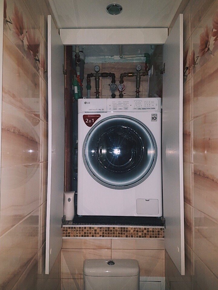 Где только не располагают стиральные машины владельцы квартир. Стиралка может стоять на кухне, в коридоре (в специальном месте в шкафу), и даже... в туалете. ЛАЙФХАК для маленьких квартир: стиральную машинку можно расположить в туалете. В ванной заказчики данной квартиры не хотели занимать пространство, там хорошо встала полноценная раковина с тумбой. Тогда отличной задумкой стало поставить стиралку в туалете над унитазом. Сделали специальный каркас, выложили его мозаикой бежевого цвета, и поставили машинку с сушкой, чтобы не ставить сушилку. А в каком необычном месте вам приходилось видеть стиральную машину?