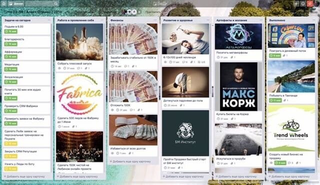 - Скажите, пожалуйста, куда мне отсюда идти? - А куда ты хочешь попасть? - Мне все равно. - Тогда все равно, куда и идти. - Только бы попасть куда-нибудь. - Куда-нибудь ты обязательно попадешь. Нужно только достаточно долго идти. (Алиса в стране чудес. Льюис Кэрролл). 🤨 Расскажу про мощную штуку - доска желаний. Эта тема трансформировала ни одну жизнь. Она поможет создать фокус на долгосрочных целях и раздробить их на маленькие шаги. Останется лишь сесть в этот поезд и смотреть, как меняется все вокруг тебя в том направлении. Которое вы определили. Для наглядности и лично я использую задачник Trello. Там несколько колонок по сферам жизни и целям по ним. И моя любимая колонка «На сегодня» (слева) и «Выполнено» (крайняя правая). Мозг любит обесценивать свои успехи и часто фокусируется на неудачах. Тут то она и вступает в дело. 🤯 Основная цель - мамонт, которого надо съесть. А «На сегодня» - это не большие кусочки, по которым его можно раскидать и не словить перенасыщение. 😏 Это одно и