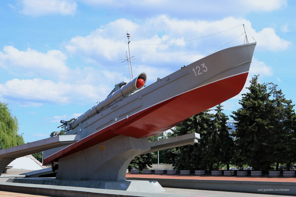 На правом берегу реки Новая Преголя, недалеко от Деревянного моста, установлен на постаменте макет торпедного катера проекта 123К, как часть мемориала "Памятный знак морякам-балтийцам". Мемориал был возведен в 1978г, и на нем тогда был установлен настоящий боевой катер. За прошедшие годы он, к сожалению, пришел в полную негодность и в 2010г был заменен макетом, изображающим торпедный катер проекта 123К (выполнен он, кстати, довольно хорошо, и издалека выглядит вполне аутентично). Катера проекта 123К - последний вариант разработанного еще в 1939г проекта 123 "Комсомолец". Строились они на заводе №831 в г. Феодосии в 1951-55гг. Всего изготовлено 205 ед. Не совсем понятно, почему для памятника катерникам времен ВОВ был выбран явно послевоенный проект (хотя во многих источниках, и в т.ч. в Википедии, утверждается, что катер якобы изображает проект 123-бис (вып.в 1943-48гг), совершенно очевидно, что это не так). Катера проекта 123 и его модификации воплощали еще предвоенную советскую конце