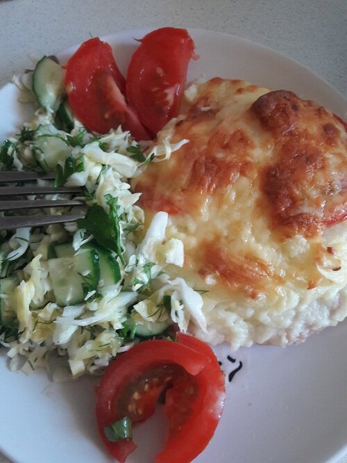 Такое блюдо прекрасно подойдет как на праздничный стол, так и на повседневный ужин. Но самое главное, что такая курочка понравится всем. Нам понадобится: 3 шт. куриного филе 6 ст.л картофельного пюре 1 большой помидор 100гр сыра 50гр сметаны соль, перец по вкусу Куриное филе делим на две части, и отбиваем. У нас получается 6 кусков мяса. Соли, перчим по желанию добавляем чеснок и любые специи. Берем противень, смазываем маслом и кладем на него мясо. На каждую отбивную распределяем картофельное пюре. Нарезаем кольцами помидор и укладываем сверху картофеля. Сыр трем на терке и смешиваем со сметаной, распределяем по всей поверхности. Ставим в разогретую духовку и выпекаем примерно 25 минут, пока не появится аппетитная, румяная корочка. Достаем и зовем к столу домашних. Приятного аппетита! Если вам понравился рецепт, то ставим пальчики вверх и подписываемся на мой канал!