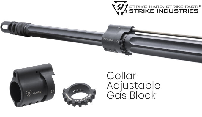 Strike Industries представили новую деталь для модернизации стрелковой платформы AR-15, ранее анонсированную на оружейной выставке SHOT Show 2019 в начале года, в виде регулируемой газовой муфты CAGB (Collar Adjustable Gas Block — Регулируемая Кольцом Газовая Муфта) с пятью разными по размеру диаметрами сквозных отверстий портов и одним полностью закрытым режимом. Настройка производится вручную или с помощью стороннего вытянутого объекта поворотом кольца за выточки с квадратным сечением даже при условии установленного "цевья". Пять различных диаметров отверстий портов позволят настроить стрелковую систему под множество условий будь то дульные устройства, мощность патрона, тяжесть пуль, сторонние детали, уровень загрязнения, длина ствола, окружающая температура и погода.