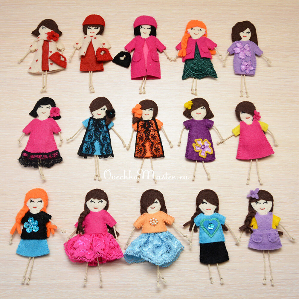 Всем добрый день. В этой статье хочу затронуть сразу 3 темы: сделать обзор готовых работ и возможно вдохновить кого-нибудь на фетровое творчество. Показать и рассказать, что делать с этими куколками и кому они вообще нужны. И задать вопрос (такой мини-опрос): какой вариант ножек лучше? Поехали. Редко делаю я коллективные фото. Но вот нашла такую кукольную компанию. Эти броши маленькие, размер их около 10 см. В конце статьи я добавлю видео для наглядности. Кому интересно - посмотрите. Броши-куколки - это несомненно дело вкуса. И здесь важно правильно подобрать одежду, с которой они будут сочетаться. Вот, например, фетровая куколка с трикотажным платьем на трикотаже! По-моему, идеально! Но я сама предпочитаю овечек))). Кто их еще не видел - обязательно посмотрите. Ссылку также оставлю в конце статьи. Ну и еще мне нравятся самые разнообразные, порой совсем странные и необычные, намешанные из всего - броши в стиле Бохо. Возвращаюсь к куколкам. Вообще такие яркие и смелые броши хорошо