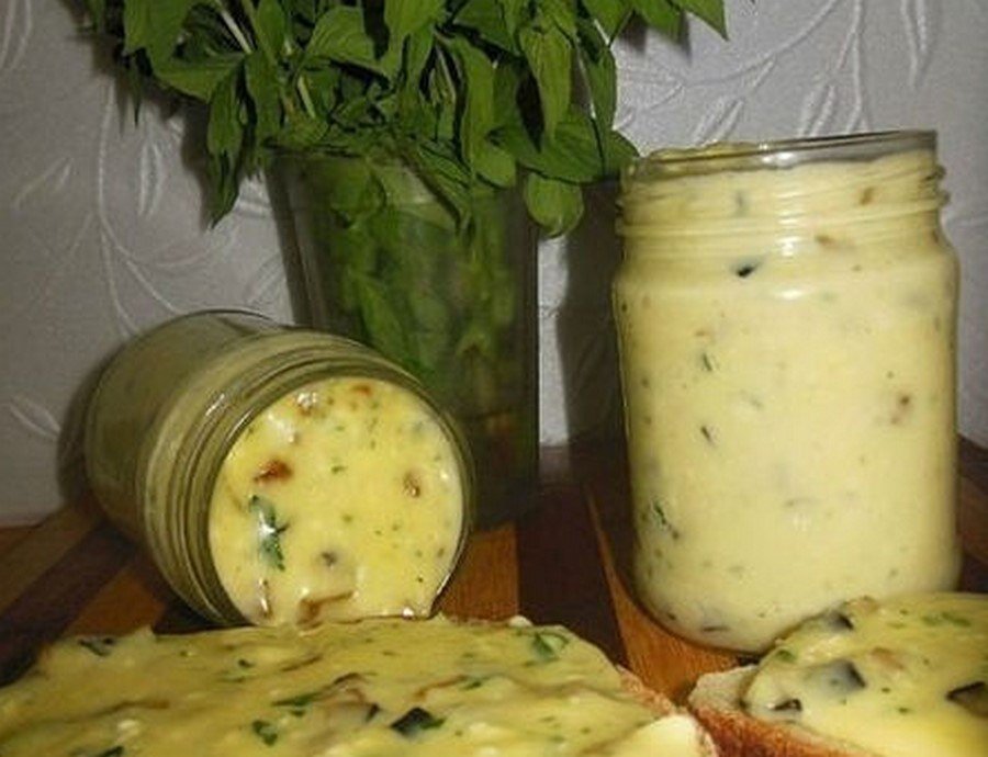 Здравствуйте дорогие мои читатели Ингредиенты: - пачка творога (у меня 500 гр домашнего творога) 2 яйца 2-3 ст.л сметаны(домашняя) соль по вкусу(примерно 1 ч.л без горки) 1 ч.л соды(не полная без горки) петрушка 5 веточек(можно укроп)(мелко порезать) 200 гр грибов(шампиньоны) Приготовление: 1. Все ингредиенты смешиваем,и взбиваем все погружным блендером. 2. Ставим кастрюлю на водяную баню, помешивая варим (около 15 минут) а в это время масса расплавится, станет однородной(я поместила кастрюлю в сковороду, предварительно набрав в нее воду) 3. Если даже при расплавлении масса не совсем однородная,можно еще раз воспользоваться блендером(пока в сыр не добавили грибы!!!!) 4. Грибы мелко нарезаем и обжариваем на растительном масле, до готовности(слегка посолить, можно добавить черный молотый перец) 5. Когда творожная масса полностью расплавится, добавляем петрушку, и жаренные грибы, хорошенько перемешиваем 6. Сразу же выливаем в формы(можно в стеклянную баночку),и обяз