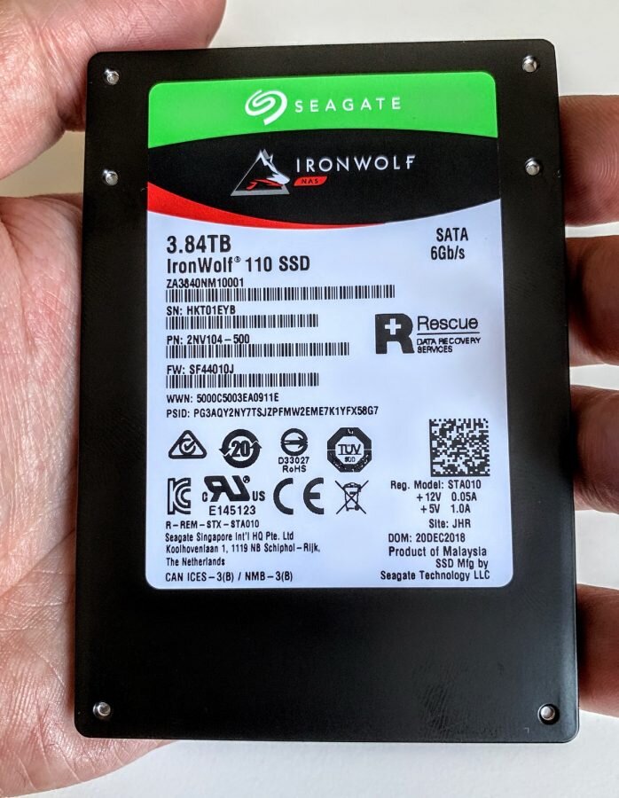 Давайте не будем тянуть резину. В США Seagate IronWolf 110 объемом 3.84 Тбайт стоит 1000 долларов плюс налог с продаж. Это значит, что в нашей неустанно богатеющей стране он обойдется в сто тысяч рублей. Это минимум.