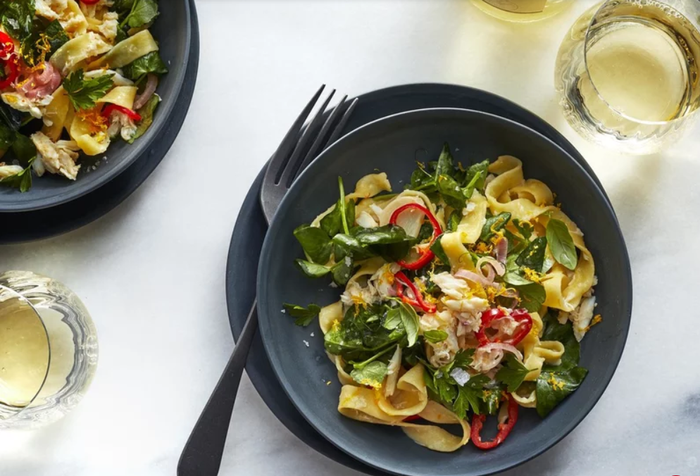 Ингредиенты Как это сделать Шаг 1 Приготовьте пасту в подсоленной воде в соответствии с указаниями на упаковке. Слейте, оставив 3/4 стакана воды для приготовления пищи. Шаг 2 Растопить 1/4 чашки масла в большой сковороде на среднем огне до образования шипящих. Добавьте лук-шалот, чеснок и чили; варить, часто помешивая, пока лук не станет мягким, 3-4 минуты. Приправить кошерной солью по вкусу. Шаг 3 Добавьте вино и возвращайтесь к кипению на среднем огне. Продолжайте варить на медленном огне, периодически помешивая, пока не уменьшится примерно наполовину, примерно на 4 минуты. Добавьте лимонный сок и возвращайте к кипению; готовить 1-2 минуты. Добавьте крабовое мясо; аккуратно подбрасывать, чтобы покрыть. Шаг 4 Добавьте приготовленную пасту и оставшееся 1/4 стакана масла. Готовьте, постоянно помешивая и встряхивая, пока масло не растает и не образуется соус, 1-2 минуты. Добавить побеги гороха, аккуратно подбрасывая до полного увядания, добавляя 1/4 стакана зарезервир