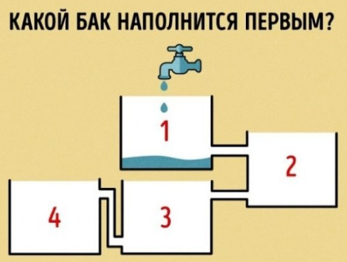 Данный тест состоит из 3-х вопросов, на которые правильно ответит только очень умный! Предлагаем вам попробовать себя! Результаты в конце теста! 1. Какой бак наполнится первый? А: Бак № 1 и № 4 Б: Бак №3 и №4 В: Бак № 3 2. Сколько кубиков на данной картинке? А: 8 Б: 6 В: 9 3. Что не так с этой картинкой? А: Ошибка в переводе Б: Ошибка в слове В: Ошибка в правописании Ответы на вопросы: 1. Правильный ответ - Б: Бак №3 и №4 Баки будут наполнятся равномерно и не наполнятся доверху. 2. Правильный ответ - В: 9 Если вы указали другой ответ, значит вы только 6 видимых блоков, но забыли про 3 блока которые держат эту пирамиду! 3. Правильный ответ - В: Ошибка в правописании В этом треугольнике дважды повторяется артикль THE, но наш мозг зачастую читает это как одно предложение! Если ты ответил на все вопросы правильно, напиши об этом в комментариях! Ставьте пожалуйста "Нравится" нам очень приятно!