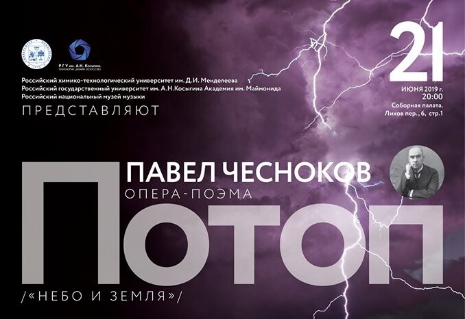 Мировая премьера единственной оперы Павла Чеснокова «Потоп» («Небо и Земля») переведена из формата «Закрытый показ в Московском метрополитене» в открытое концертное мероприятие. Историческое событие состоится 21 июня 2019 года в 20:00 в Соборной палате (Лихов пер., д.6). В прошлом году руководитель одного из старейших любительских хоров (РХТУ им. Д.И. Менделеева) и одного из самых необычных (хор Московского метро), создатель крупнейшей сетевой нотно-музыкальной библиотеки Борис Тараканов обнаружил партитуру единственной оперы, пожалуй, самого известного и исполняемого церковного композитора Павла Чеснокова, само предположение о существовании которой считалось чуть ли не мифом. «Единственная опера потомственного регента была написана перед самой революцией на собственное либретто по мотивам одноименной мистерии Байрона. И сюжетно описывала события, которые произошли... за сутки до Всемирного Потопа» - рассказал Борис Тараканов в интервью «Музыкальному Клондайку». Исполнители: Лауреаты
