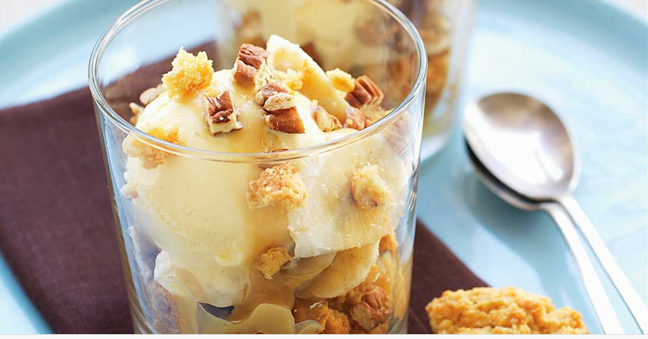 1. Анзак Парфе с карамельным соусом 8 мин готовить Ингредиенты способ приготовления 1. Поместите масло, сахар, сгущенное молоко и золотой сироп в маленькую кастрюлю и помешивайте на медленном огне, пока сахар не растворится. Доведите до кипения и варите 5 минут или пока смесь не станет золотой. Размешайте сливки до получения однородной массы и варите 1-2 минуты или пока они не загустеют. 2. Разделите измельченное печенье на основу из 6 высоких бокалов для десерта. Вершину украсьте ломтиками банана, шариком мороженого, жареными орехами пекан и карамельным соусом. 3. Залейте еще одним шариком мороженого, карамельным соусом и украсить орехами пекан. Бублики с клубникой 10 минут готовить Ингредиенты Способ приготовления 1. Нарежьте каждый бублик пополам и поджарьте 2. Нанесите на каждый бублик примерно ½ стакана сыра рикотта. Поверх сыра нанесите мед 3. Нарежьте клубнику в форме сердца и украсьте ей вершину десерта 5-минутный красный бархатный пудинг 5 минут готовить Инг