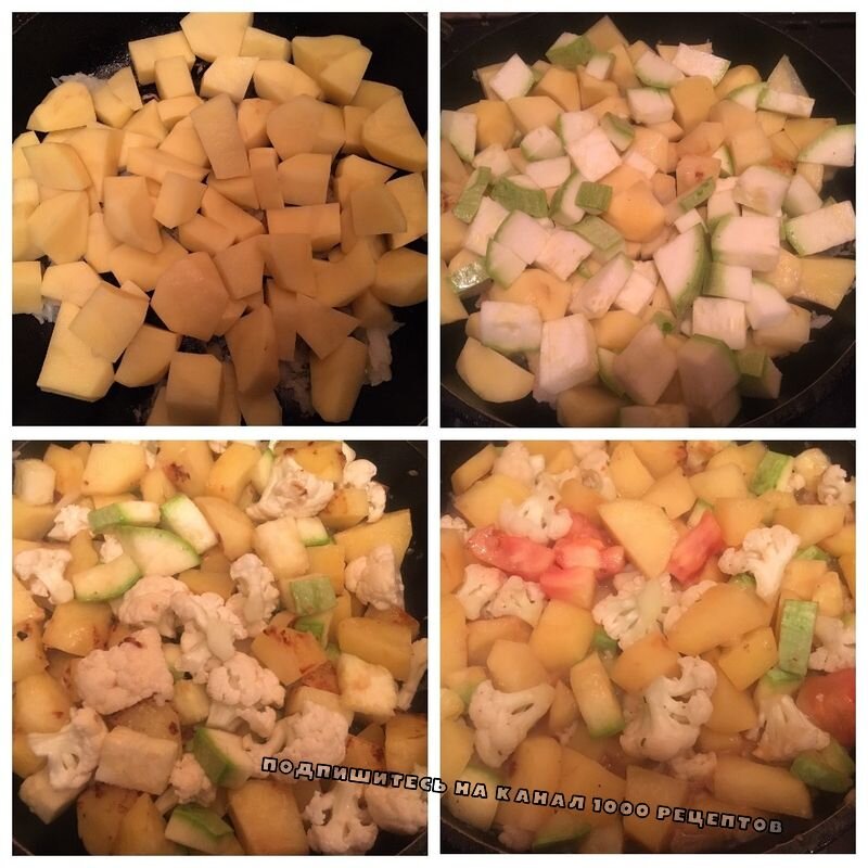 - Добавьте ломтики картофеля, цуккини и хрустящие соцветия; тушите 11-16 минут, накрыв сковороду крышкой (воду или бульон добавлять не стоит, овощи сами дадут сок).