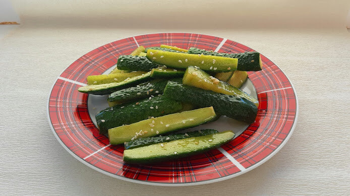 Праздничный стол должен быть всегда богат не только горячими блюдами, но и ароматными закусками. Огурцы по-корейски – великолепное блюдо, актуальное в любой компании в любую пору. Огурцы — 500 г Соевый соус — 1 ст. ложка Уксус 9%— 1 ст. ложка Чёрный и красный молотый перец — по 1/3 ч. ложка, Соль — 1/2 ч. ложка, Кунжут — 1 ст. ложка, Чеснок — примерно 4 зубчика, Растительное масло — 2 ст. ложки.