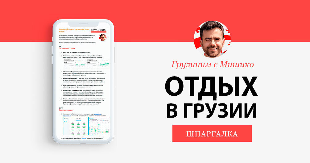 Каждый раз, когда я собираюсь поехать в новую страну я нервничаю. А ведь подготовка к 🇬🇪 Грузии может быть без стресса! Надо столько всего сделать. Так много узнать и спланировать. Порой хочется все бросить, потому что: ❌ Я устал рыться часами в интернете ❌ Выуживать полезную информацию ❌ Я не понимаю в какой город мне лететь сначала и еще 1000 причин... Поэтому я создал крошечную шпаргалку. Всего 4 страницы в PDF. Каждая из этих страниц наполнена только полезной информацией. Потому что 6 лет я постоянно летаю в Грузию. Прожил там 259 радостных и комфортных дней. Да, эта шпаргалка платная. По цене, как грузинский шашлык :) Можно купить в два раза дешевле – за стоимость 5 хинкали, но нужно стать подписчиком на Грузиним блоге. Подробности здесь ↩︎ Комфортного отдыха тебе в Грузии! Спасибо,