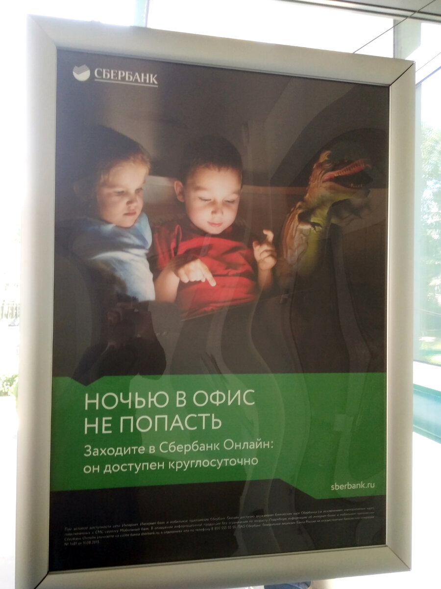 В первой части про детей и Сбербанк я рассказал, как банк возможно манипулирует нашими детьми. Сегодня вторая часть. Возможно, что-то уже изменилось в законе о рекламе, но раньше нельзя было использовать изображения детей для рекламы товаров, не предназначенных для детей. То есть для рекламы соков и шапочек - ok, а вот для рекламы автомобилей - нет. Хитрые рекламщики, конечно, находили лазейки и говорили, что мол на автомобиле же можно и детей возить, значит он и для детей тоже. Тем не менее, посмотрите вот на этот плакат. Сбербанк Онлайн доступен круглосуточно. Именно это они и хотели прорекламировать. Отлично. Но тут возникает сразу несколько вопросов. 1. Почему Сбербанк призывает к тому, чтобы дети пользовались банковскими услугами без взрослых? Секундочку - а со взрослыми? Вообще-то дети такого возраста в принципе не могут пользоваться банковскими услугами. Это же не в тетрис играть. Это банковские услуги. 2. Ещё раз посмотрим на картинку и прочитаем текст - "Ночью в офис не попаст