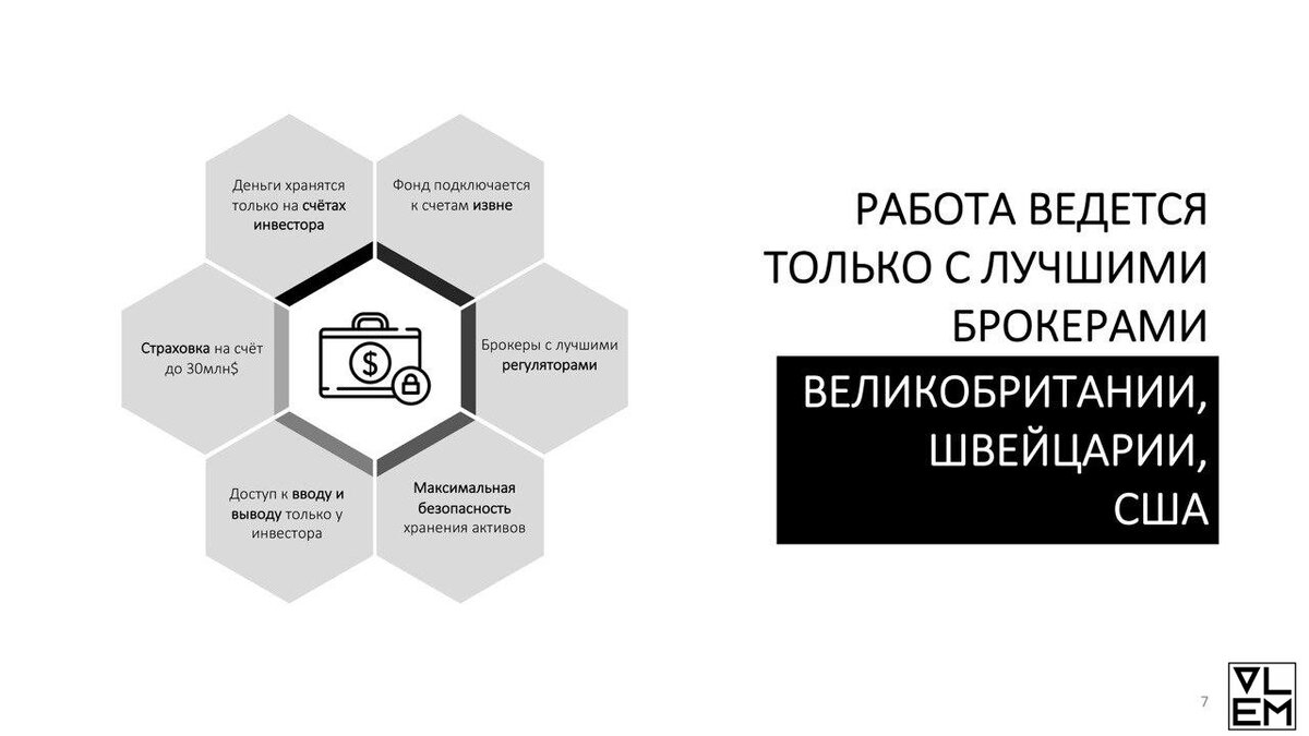 VL&EM—Закрытый инвестиционный клуб, ориентированный на максимизацию доходности при заданном риске или минимизацию рисков для заданной доходности. Представляет собой пул активов инвесторов, управляющийся профессионалами в интересах инвесторов. Работаем только с брокерами Великобритании , Швейцарии, США. Страхование по счетам у нас до 30млн $ США. История торговли алго - 7 лет , средняя доходность за 7 лет, 8-12% в месяц. Максимальная просадка по счёту была - 25% . Максимально убыточный месяц -2%, убыточных кварталов не было. Статистика вся подтверждается стейтментами (это выписка по счёту, предоставленная брокером о торговле трейдера) Ни один профессиональный хедж фонд не может ГАРАНТИРОВАТЬ определенный доход , всё судится по истории. Резервные фонды и прочее - это изобретение наших российских скам проектов. Такого нигде нет и быть не может (на проф.рынке). Мы не торгуем руками , наша система полностью роботизирована . В команде кто разрабатывали алгоритмы , сильные математи