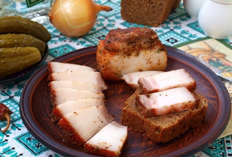 Так солят сало во многих деревнях до сих пор. Это очень просто, а в результате сало - необыкновенное выходит. Ингредиенты: 1-1,5 кг сала с мясными прослойками или грудинки 1 головка чеснока Для рассола: 1 л воды 0,5 ст. соли крупной 1 горсть луковой шелухи 2-3 лавровых листа 15 шт. черного перца горошком Приготовление: 1. В большую кастрюлю выложить подготовленную луковую шелуху и все специи для рассола. 2. Залить все водой и довести до кипения. 3. Сало разрезать на удобные куски и опустить в кипящий рассол так, чтобы оно было полностью им покрыто. 4. Прокипятить сало в маринаде не более 10 минут.