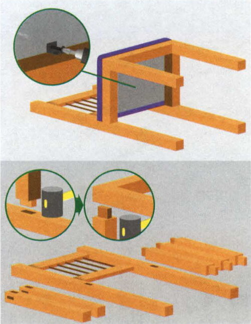 В расшатавшийся деревянный стул не следует забивать гвозди, вкручивать шурупы или укреплять металлическими уголками. Подобный ремонт обеспечит всего лишь временную целостность предмета мебели, а на самом деле со временем приведет к полному разрушению. Рассмотрим надежное и единственно правильное решение. Инструменты и материалы для работы: отвертка, кисточка, киянка, серпянка. Если старый стул расшатался Снимаем сиденье и с помощью резиновой киянки аккуратно разбираем стул на составные части. Затем каждый шип покрываем клеем и оборачиваем серпянкой так, чтобы ее край не доходил до основания шипа 3-5 мм. В завершении промазываем шипы и пазы каждой детали, далее собираем стул в обратном порядке, сплачивая все стыки резиновой киянкой.
