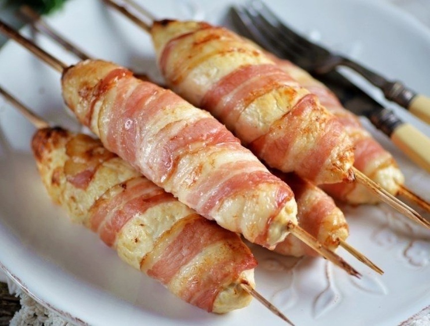Ингредиенты: Куриное филе - 2 шт. Лук репчатый - 0,5 шт. Яйцо - 1 шт. Манка - 1-2 ст.л. Соль - по вкусу Перец ч.м. - по вкусу Бекон - 40 г Масло растительное - 1 ст.л ⠀ Приготовить это блюдо можно как в духовке, так и на мангале, второй вариант просто очень-очень вкусно получается. Кстати, приправить фарш можно по своему вкусу, очень мне нравится добавление зиры, тимьяна, сушеного чеснока и т.п., а вы добавьте свои любимые ароматные специи. ⠀ Приготовление: 1.Нарежьте филе крупными кусочками, лук измельчите, сложите все в блендер, смелите в фарш. 2.Переложите фарш в глубокую миску. 3.Добавьте манку, она впитает лишнюю воду из фарша, добавьте яйцо, соль и перец по вкусу. 4.Замесите однородный фарш, дайте время манке набухнуть. Поставьте фарш на холод минут на 30. 5.Мокрыми руками разделите фарш на порции, дальше его нужно нанизать на деревянные шпажки в виде кебабов, полоской бекона оберните кебаб по всей длине. Можно куриное "эскимо" завернуть в бекон полностью, а можно слегка, в этом