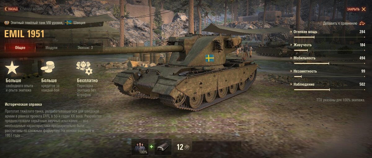 Подходит к концу 5 эпизод "Линии фронта", а значит все больше и больше игроков уже успели обзавестись наградной техникой за этот режим игры. В данной статье мы рассмотрим ТТХ и особенности игры на тяжелом премиум танке Швеции EMIL 1951. Именно в 5 эпизоде "Линии фронта" стала доступной возможность приобретения за очки доблести EMIL 1951. С каждым днем все больше и больше танкистов получает в свое распоряжение данную машину. Тем не менее большинство блогеров и стримеров считают данный танк имбалансной. Давайте же разберемся, так это или нет? Огневая мощь танка Танк обладает средним уроном в 360 единиц с пробиваемостью брони в 217 мм, что делает его одним из самых мощных танков среди VIII уровней. При базовой перезарядке орудия в 5,16 сек, EMIL 1951 способен выдавать около 1850 урона в минуту. Танк обладает приятным УВН -12/14 градусов, что позволяет вести огонь показывая только башню. Броня и мобильность EMIL 1951 получил 1400 очков жизни и не очень достойную броню для тяжелого танка, о