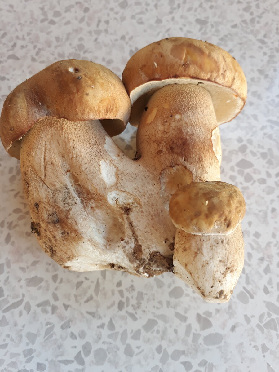 Пошли мы сегодня на разведку за грибами. Жара стояла почти весь конец мая и начало июня. Но вот, наконец, пролил обильный дождь. Появилась надежда, что пошли грибы. Вернее, снова пошли, так как в 20-х числах мая мы уже набирали по корзинке белых. Этот красавец как раз из майской добычи. Потом грибы неожиданно кончились и началась жара. На многих сайтах в интернете пишут, что пошли колосовики, и даже подосиновики появились, хотя они обычно раньше июля не показываются. Вот мы и решили пройтись по лесу, надеясь что-нибудь найти на жаренку, а если повезет, и на суп. Лес у нас прямо за забором. Живем в окружении лесов и озер в Новой Москве. В прошлом году носили корзинами подосиновики и белые, почти не отходя от дома. Далеко в лес мы не заходим. Гуляем по своим грибным местам, осматриваем полянки и вырубки. И без грибов никогда не возвращаемся. Но сегодня нам не повезло. Смогли найти только небольшую стайку лисичек, один белый гриб, пару маслят и подосиновик
