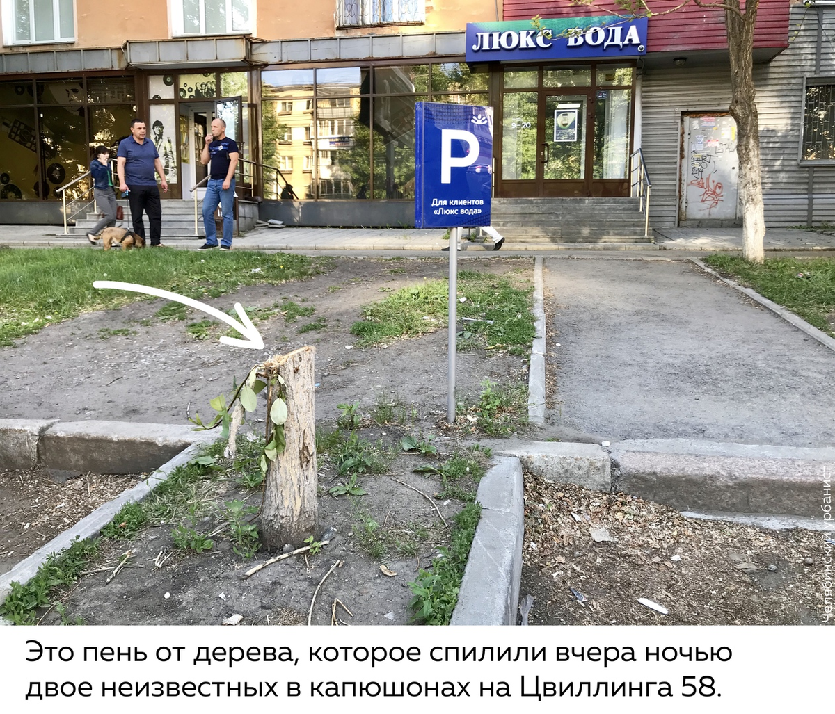 Вчера вечером двое неизвестных в капюшонах спилили два дерева в центре города. Деревья находились напротив магазина «Люкс вода».