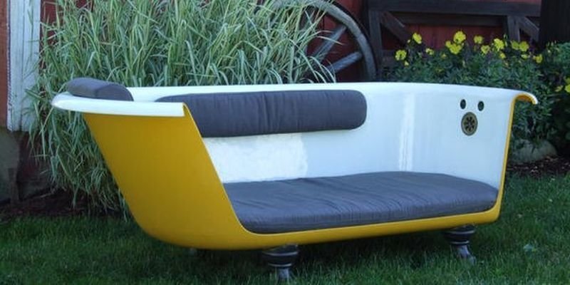 1. Да-да, именно в ванне. Вот такой вариант использования старой ванны на даче я нашла в сети. Сама бы никогда не догадалась – моя ванна используется только для поливочной воды – а вот люди создали такую простую и функциональную мебель из отслужившей свой срок ненужной вещи. Если в моем распоряжении появится еще одна такая сантехническая емкость, то можно будет задуматься о диванчике под открытым небом или о креслах с оригинальным столиком.
