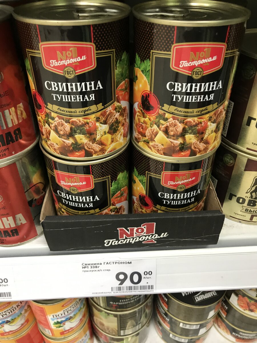Всем привет, продолжаем пробовать всякое баночное консервное. Сегодня свинина под брендом "Гастроном №1". Купил в "Пятерочке", соблазнившись нарядной банкой и бюджетной ценой. Всего 90 рублей за 338 граммов, за кило выйдет 266 руб. При ближайшем рассмотрении оказалось, что это никакой не "Гастроном №1", а вовсе даже хорошо известный нам (с плохой стороны) "ПО Лужский консервный завод", чью скверную говядину мы пробовали в январе. Но халтурщик качественно замаскировался. Хорошая полиграфия, симпатичный дизайн и приятный внешний вид. Громкие заявления про "ГОСТ" и "Высший сорт" — в наличии. Смотрим, что в составе: Свинина, лук, лист лавровый, перец чёрный Массовая доля мяса и жира не менее 59%. Звучит обнадеживающе, давайте глянем, что внутри. Ключ на банке, кстати, есть. Кусок плавает в жидкости, откровенной некондиции не видно. Хотя запах неаппетитный, воняет чем-то прелым. Будем рассматривать поближе. Видны волокна, много жирных кусков, жидкость просто вылилась на тарелку без всяк