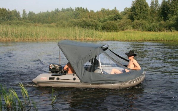 Хороший тент, который надежно крепится на прочную опорную часть, превратит обычную надувную лодку из ПВХ в своеобразную палатку, где рыбак может в комфорте перемещаться по воде и хранить различные приспособления.