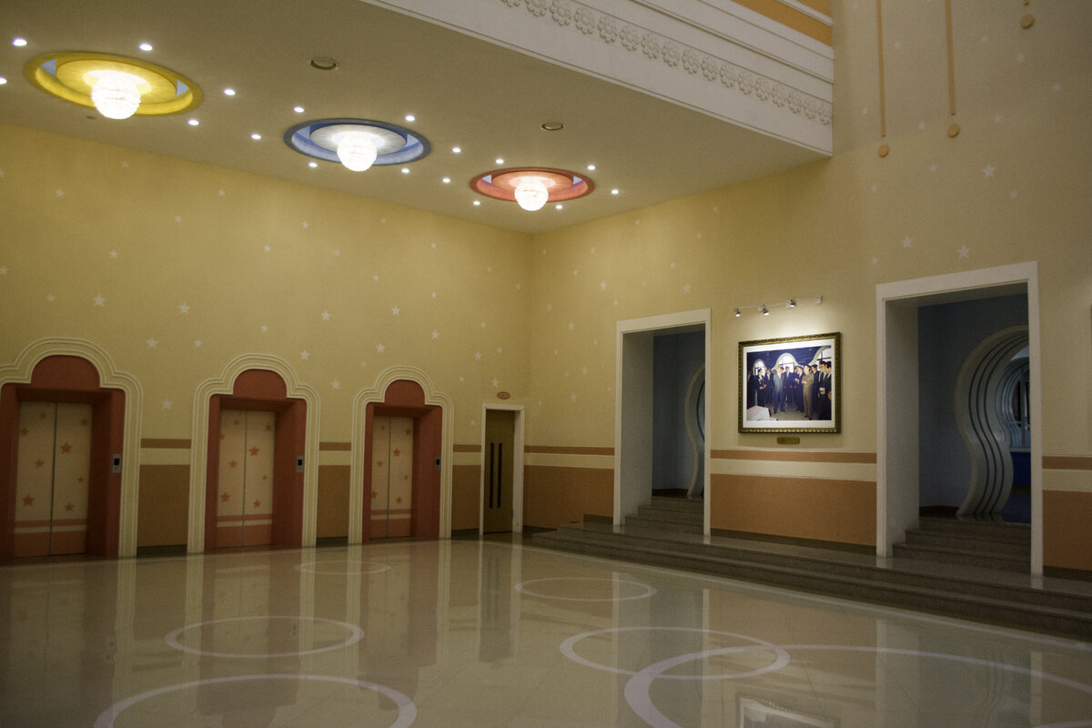 Фойе с игривыми порталами лифтов по дороге в бассейн: