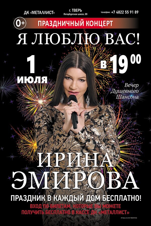 В рамках гастрольного тура с концертной программой «Я люблю Вас» по городам России в Тверь приедет Ирина Эмирова. Концерт пройдет 1 июля в ДК «Металлист». Начало в 19:00.