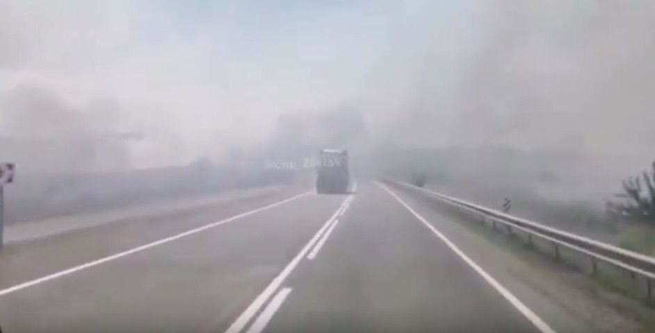 На кадрах видна плотная дымовая завеса над дорогой. Дым распространяется из-за горящих полей вдоль трассы. Из-за этого видимость дороги на довольно большом участке дороги крайне снижена.