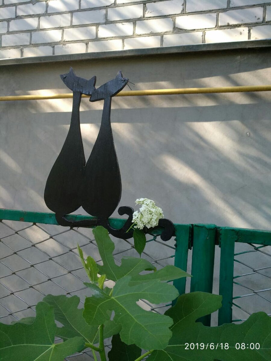 У меня на заборе живут два влюбленных котика. Они хоть как-то освежают неприглядную стену соседского дома. Котов я сделала из 10 мм фанеры. Выпилила их с помощью электрического лобзика. Размер можно сделать любой вот по этой схеме. Моя поделка около 60 см в высоту. Почему чёрные? Потому что в этом цвете они выделяются на заборе. Пробовала выкрасить в белый цвет, но тогда коты сливаются со стеной. Вот такая незамысловатая поделка получилась. Прикрепила их к забору проволокой.