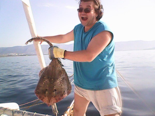 Бортовой журнал. Том 3. Геленджик (2013). Дни 117-131 Ближе к осени, после отъезда Пети и девушек, в экипаж влился пират Женёк. Я стоял то на Центральном, на Тортуге, нашел там работу, не такую активную, как на Центральном, но без лишней конкуренции и шума. Взял парня в помощь на капитанские 20% от заработка. И не пожалел. Капитан от Бога, хулиганист, грубовато-весел, всё знает и умеет. Правда, сложно притирались: пират ну никак не соглашался на должность помощника, капитан - и все тут. Так на Дукате за все время его путешествия уживались сразу два Капитана. Это были очень увлекательные два месяца. Мы открыли уникальное развлекалово для туристов: "акулью рыбалку", возили далеко от берега ловить скатов и катранов. Два выезда делали для одной компании: один раз часа на три вечером, потом на три часа на рассвете, проверить снасти. Скаты ребята крепкие, подчас поплавок утаскивали на километр, приходилось долго искать. А уж вытаскивать со стометровой глубины этих монстров - просто полные п