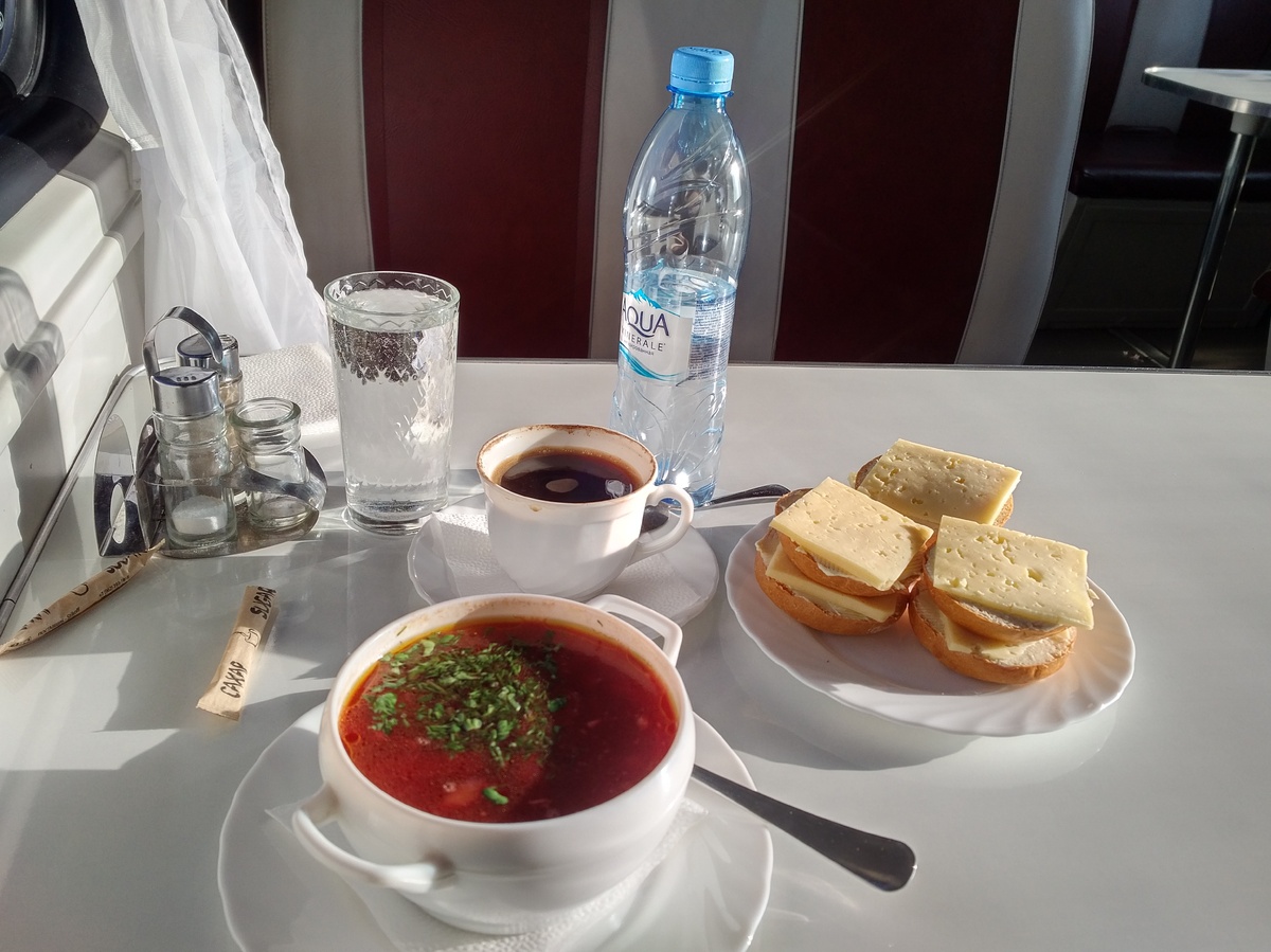 Обед с видом на Байкал. На четвёртые сутки без нормальной еды я не выдержал и пошел проверять, что за ресторан едет от Москвы до Владивостока. Жалею, что раньше не пошёл. От мерзкой сухомятки и курева на морозе уже пасть болит. После Красноярска во весь рост встал вопрос, почему в поезде Россия цыгане сушат белье на свободных полках, а речь вокруг только узбекская. Алё, поездама... Узбеки при малейшей ловле сигнала тут же включали мобильник и звонили друзьям по громкой связи. Самое замечательное, что они едут рядом со мной и до самого Владивостока...