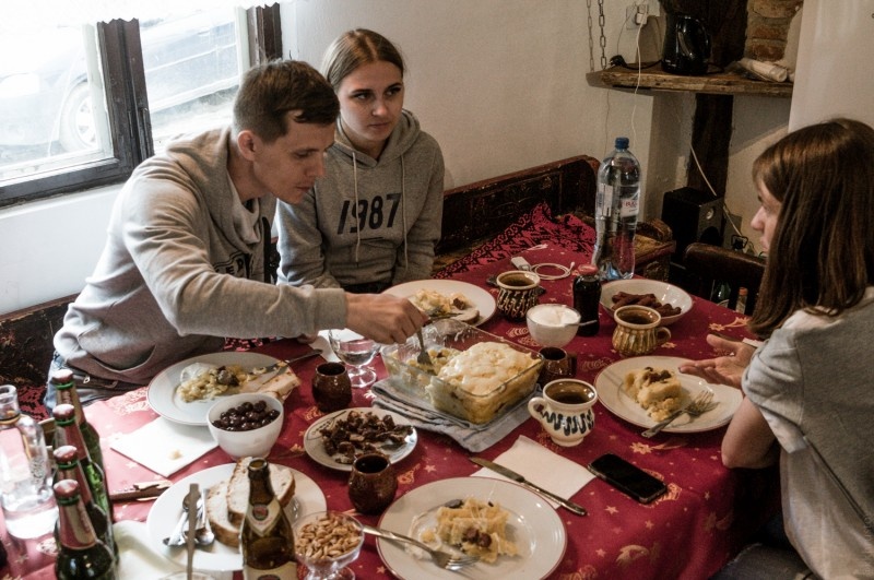 Есть плохие отели, есть хорошие. А есть такой класс жилья, где не просто хорошо, но и интересно! При этом стоить это может дешевле стандартного номера. В одном из таких мест мы и останавливались на ночлег в этот раз. Наш путь лежал из города Турда в Бран (Румыния), и нужно было где то переночевать. Мы забронировали жилье на airbnb. Фишка в том, что это не просто дом, а дом со столетней историей. Он сохранил традиционное румынское убранство и уклад. Хозяин встретил нас на въезде в деревню, что бы мы не потерялись на узких улочках и сразу повел на кухню, угостить домашним самогоном. Девочкам вино само собой. Это был третий раз, когда нас так радушно встречали. Думаю, что на Балканском полуострове это норма. Дальше был ужин. Трудно перечислить все названия блюд, но я постараюсь. Основным была запеканка из мамалыги (каша из кукурузы) и козьего сыра. Закуски: пастрома (что то вроде карпаччо или строганины), колбаски из козьего мяса, сметана, домашний хлеб. На десерт пирог и пьяная вишня.