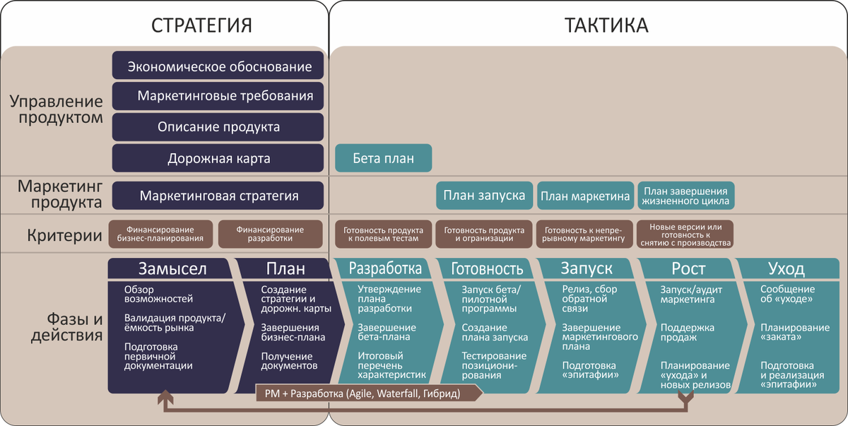 Многие компании делают ошибку, перепрыгивая прямо в разработку, особенно при работе с командами по гибким методологиям, без должных усилий по предварительной проработки экономических аспектов продукта. В дальнейшем при разработке продукта по ОПП действительно можно использовать любые методологии (гибкие, водопадные, гибридные) – фаза планирования обеспечивает уверенность, что все критические вопросы о стратегии и бизнесе рассмотрены независимо от используемых методов разработки.