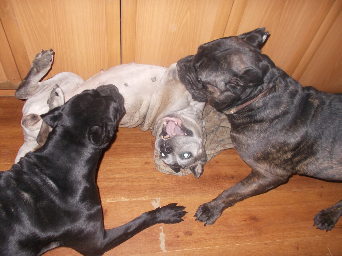Вот кане корсо между собой кусаются: скачут, р-р-рычат, лапами машут, зубы скалят.