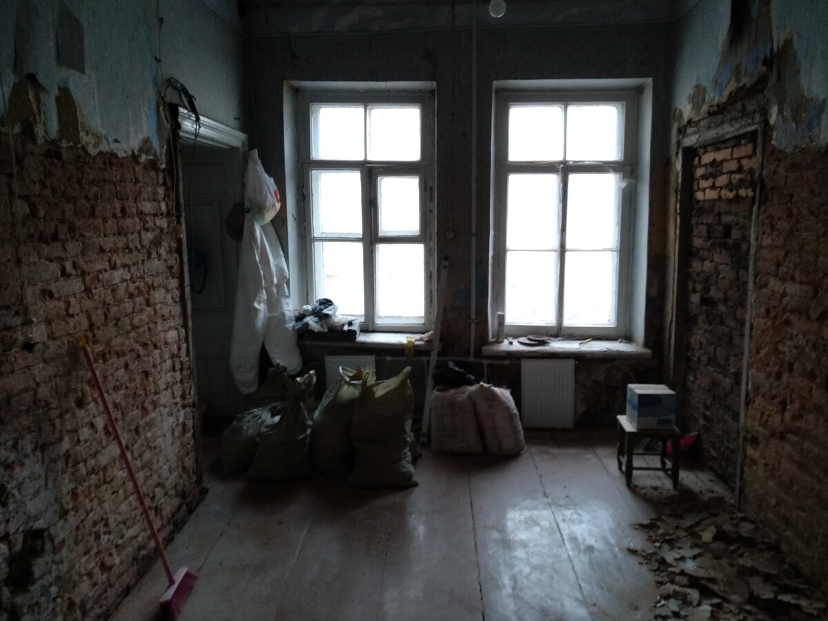Начинаю ремонт в комнате (будущей студии). Сначала задача сбить всю штукатурку и обои. Добраться до кирпичных стен, оценить их состояние, уровень, возможно найду вентиляционные каналы, так как планирую делать кухню и ванну с туалетом. Работаем!