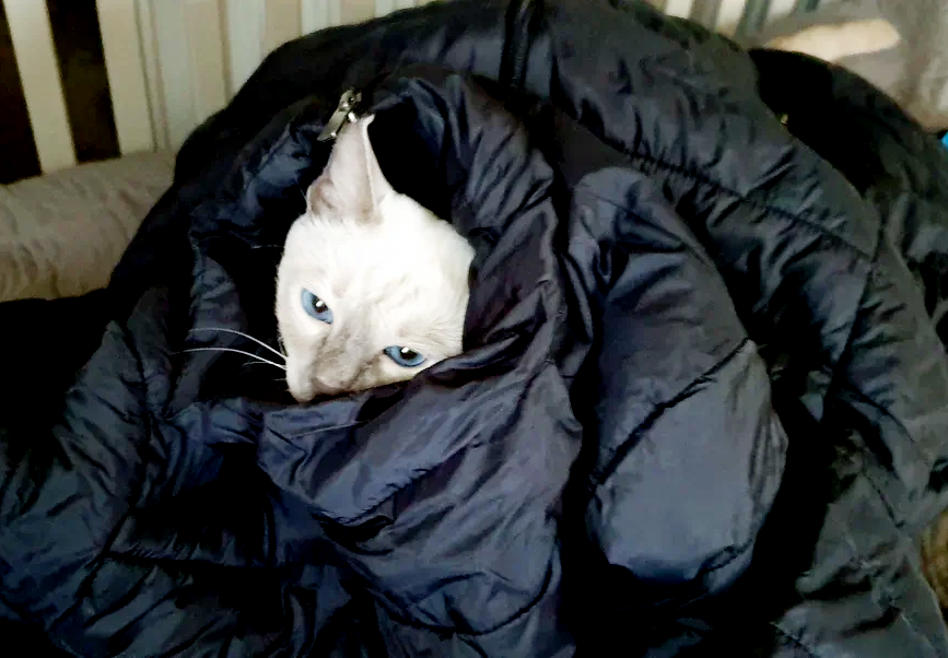 Сперва она меня потеряла, потом случайно нашла, пытаясь отнести куртку вместе со мной в кладовку, а потом и вовсе решила, что у меня толстая попа (это неправда!!!) и я застрял в рукаве куртки...