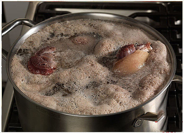 Обычно мы заливаем мясо холодной водой и, дожидаясь закипания, тут же начинаем снимать пенку. Пенка на поверхности бульона есть ни что иное, как свернувшийся белок. При нагревании в холодной воде растворившиеся белки и минеральные соли переходят в воду, а при закладывании мяса в кипящую воду остаются преимущественно в самом мясе.
