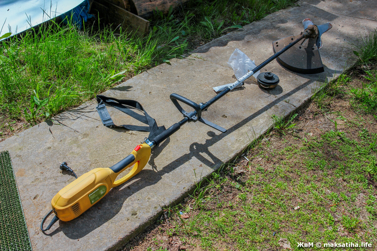 В помощники приобрел себе год назад электрокосу — недорогую, не очень мощную, но в комплекте с 4-лопастным ножом, помимо обычной лески. И так получилось, что пользуюсь в основном ножом, а не леской. Нож хорош для грубого покоса и даже кочки срезал, старую солому с земли скашивал — в общем, работа недоступная для лески. На фото ниже электрокоса в полный рост.