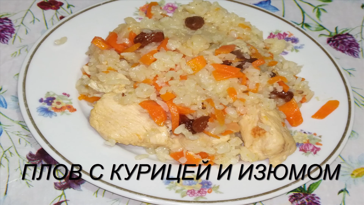 Сегодня хочу поделиться с Вами замечательным рецептом вкусного плова с курицей и изюмом. ИНГРЕДИЕНТЫ: курица – 1 тушка. круглый рис – 500 гр. морковь – 2 шт. репчатый лук – 1 шт. изюм – ¼ ст. специи для плова – по вкусу. зира – по вкусу. соль – по вкусу. подсолнечное масло - для жарки. СПОСОБ ПРИГОТОВЛЕНИЯ: Для начала нужно перебрать и промыть рис. Курицу разрезаем на средние кусочки. Морковь нарезаем тонкой соломкой, лук нарезаем на средние кусочки. В казане или в кастрюле с толстым дном разогреть подсолнечное масло и выложить кусочки курицы, периодически помешивая, обжарить до появления аппетитной, золотистой корочки. К обжаренному мясу добавить лук, затем добавляем морковь. И продолжаем обжаривать все вместе еще несколько минут. Когда овощи также озолотятся, уменьшить огонь, переложить в казан: добавить изюм, специи и соль по вкусу. Рис переложить в казан и разравнять (не перемешивать с остальными ингредиентами). Залить рис водой так, чтобы жидкость была на 1 см выше. Нак