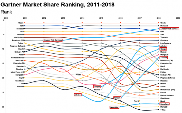 Аналитики Gartner опубликовали результаты мирового рынка систем управления базами данных (СУБД). Расходы на это программное обеспечение в 2018 году составили $46,1 млрд, что на 18,4 % превосходит показатель годичной давности. Продажи облачных СУБД, а также лицензий, размещённых в облаке, в прошлом году достигли $10,4 млрд. На этот сегмент пришлось 68 % роста всего рынка. Популярность облачных продуктов подтверждает то, что специализирующиеся на них компании Microsoft и Amazon Web Services (AWS) внесли 75,5-процентный вклад в рост всего рынка СУБД в 2018 году. По словам экспертов, львиная доля инноваций на рынке появляется либо только в облачных СУБД, либо сначала в них. «За облаками будущее. Все компании, от мала до велика, будут все чаще пользоваться ими», — считает вице-президент по исследованиям в Gartner Дональд Фейнберг (Donald Feinberg). Аналитики ожидают, что к 2022 году примерно 75 % СУБД будут запущены или перенесены в облачную инфраструктуру, и лишь 5 % систем переведут из об