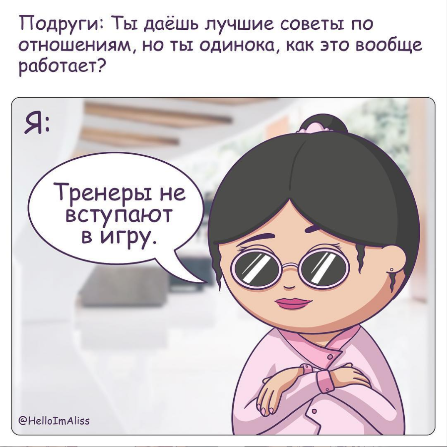 Продолжаем знакомиться с веселыми комиксами "Привет, Элис!", автор которых описывает жизнь современных девушек с высокой долей самоиронии. Вот, кстати, ссылка на автора, подписывайтесь на ее страничку в Instagram >> Привет, Элис! Девушки веселей, добрее, умнее, красивее и даже здоровее, когда у них есть "лучшая подруга". Почему? Потому что она всегда будет держать тебя в тонусе. Именно лучшая подруга скажет, что джинсы стали тебе маловаты, но при этом поделится с тобой куском пирожного. Только она позвонит тебе среди ночи, чтобы рассказать последнюю сплетню, чтобы утром ты уже была в теме. Лучшая подруга может послать тебя "куда подальше", но при этом выругаться на того, кто сделает также. о них сегодня и поговорим. Подруга-тренер, психоаналитик, а еще теоретик-отношений. Это просто клад для долгих разговоров. Хотя обычно приходится больше выслушивать ее. Ну да это мелочь. Потому что никому не известно, "что" может скрываться за этой записью. От великой тайны, до предложений, состоящих