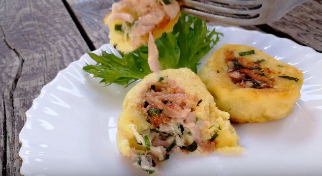 Приготовим очень вкусную простую закуску или завтрак из того что есть в холодильнике. Ингредиенты: Приготовление: Сначала нужно подготовить начинку. У меня в холодильнике оказалось 150 гр. ветчины, я ее натёрла на крупной тёрке К ветчине добавляем 70 граммов сыра натертого на мелкой терке. Ветчину можно заменить например на курицу отварную. Добавляем немного зеленого лука и хорошенько всё перемешаем. Затем приготовим картофельное тесто, если картошка горячая, то разминаем толкушкой. Если же вареная картошка вчерашняя и холодная, то натираем её на мелкой терке. В картофель вбиваем одно яйцо. Если при варке вы солили картофель, то соль уже не добавляем, а только добавляем перец и 3 столовые ложки с горочкой муки. Все хорошенько перемешиваем и замешиваем тесто. Стол хорошенько подпыляем мукой и выкладываем все тесто. Теперь формируем из картофельного теста продолговатую лепешку. Руки можно смочить в воде или в подсолнечном масле, чтобы картошка не прилипала к ним. Чистые руки с