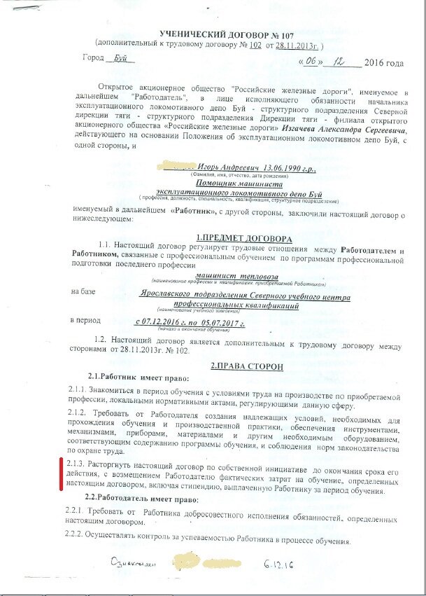 Хотелось бы рассказать случай из жизни, одного моего хорошего знакомого. Дело было еще в 2017 году ,когда ОАО РЖД заключили с ним договор на переподготовку по профессии “Машинист тепловоза”.Без лишней воды,сами факты нарушений со стороны РЖД и как итог судебное решение и исполнительный лист выкладываю ниже: 1.Это договор Договор Помечено красным: 2.1.3 ...возмещение Работодателю фактических затрат на обучение... На будущее всем кто ,подписывает такие ученические договора.Это пункт договора, нарушает трудовое законодательство РФ.<Ст.206 ТК РФ> Далее ...возмещение Работодателю фактических затрат на обучение , определенных настоящим договором... В договоре нигде нет,ни слова,ни цифры сколько Работодатель,потратил на обучение. 2. В приказе №206 на удержание денежных средств,о котором работник ничего не знал и соответственно не подписывал,указана цифра общего долга: Приказ всплыл только в ходе судебных разбирательств. Значит,Работодатель подсчитал потраченные денежные средства тол