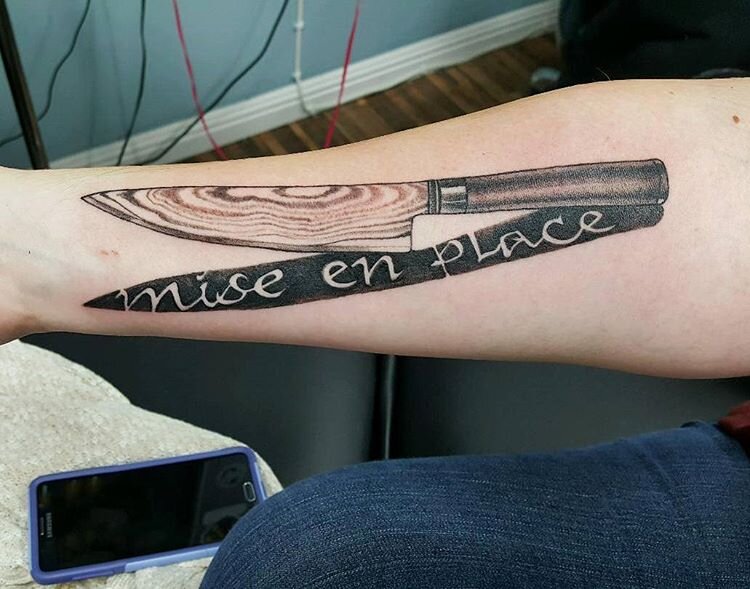 Очень популярная татуировка. Некоторые повара набивают себе подобные изображения с соответствующими надписями на кулинарную тему, вроде "Cook or die" ("Готовь или умри") или набивают несколько ножей вдоль предплечья.