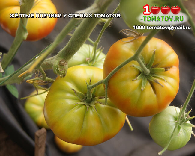 Частой причиной такого эффекта является неправильное формирование листового аппарата растений. Удаление большого количества листьев приводит к тому, что на зелёные плоды падают солнечные лучи в течение длительного времени и плоды получают чрезмерную инсоляцию. Плоды возле плодоножки перегреваются, в результате в верхней части нарушаются процессы пигментации и плод в районе плодоножки остаётся желтого или жёлто-зелёного цвета даже у зрелого томата. Для предотвращения этого нельзя полностью оголять растение, удаляя все листья, надо стараться, чтобы лист оставленный над кистью притенял плоды от солнечных лучей и длительной инсоляции особенно в полдень. В этом случае спелые плоды томатов будут равномерно окрашены. Также одной из причин жёлтых плечиков у томатов может являться недостаток калия в питании томата. В этом случае поможет подкормка сульфатом калия. Сульфат калия (калий сернокислый) - 20 г растворяем в 10 л воды и поливаем по 1 л под корень. Калий отвечает за созревание