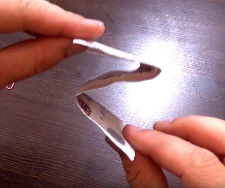 Возьмите купюру и сложите её вот так. Далее закрепите две скрепки здесь. И теперь тяните за концы купюры, расправляя её. Бум! Скрепки вылетают и волшебным образом соединяются между собой. В принципе, тут никаких секретов нет. Складывайте купюра как я показал ранее, в форме буквы z. Далее разворачиваете купюру и скрепки сами себя соединят. Они вылетают в сцепке. Очень прикольный трюк!