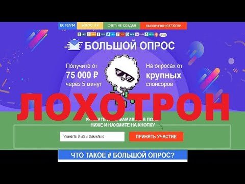 Всем привет дорогие друзья. В этом видео мы с вами пробежимся по сайту лохотрону: БОЛЬШОЙ ОПРОС Получите от 75 000 рублей через 5 минут на опросах от крупных спонсоров! Понятное дело, что не каких денег вы там за опросы не получите. После прохождения опросов в конце с вас будут вымогать деньги. Поэтому эта Лохотрон, Обман и Развод! Честный отзыв.