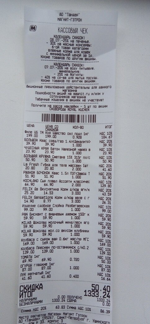 Всем добрый день! Многие думают, что в Санкт-Петербурге дорогие продукты, что всё здесь стоит намного дороже, чем в их родном городе. За исключением, наверное, только жителей нашего Севера, где цены на товары и продукты на порядок выше, чем в оставшейся части России. Но смею Вас заверить, что в СПб цены не намного, а порой даже и дешевле, чем в среднем по России. Всё это из-за того, что в Питере такие же сетевые магазины как и везде. Сегодня сходили в сетевой красный магазин под названием "Магнит", которым еще недавно владел Сергей Галицкий, но сейчас он если память не изменяет принадлежит "ВТБ", поправьте меня, если ошибаюсь. В магазине закупили обычные продукты, которые покупает большинство жителей нашей необъятной. Только так как у нас есть коты, мы еще и корм покупаем, что не входит в покупки для тех у кого нет домашних животных. Итак поехали по ценам: Итого у нас вышло: 1333,24 р. Сравнивайте с ценами в ваших городах и пишите в комментариях. Всем хорошего дня!